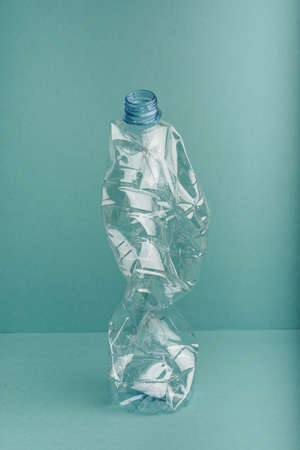 Empty rumpled used plastic bottle on blue background. Top view, copy space. Pollution, environmental protection concept. Reuse garbage, recycle, plastic free. Earth, world water day