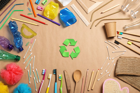 Recycling symbol and household goods on beige background, flat lay