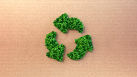 Green cardboard recycling symbol. Concept of ecology and paper recycling. Recycling mark mebius loop carved into cardboard with branches growing through it.