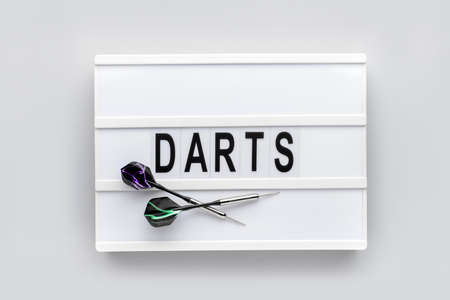 Plastic dart or arrows for darts game on grey background top view.