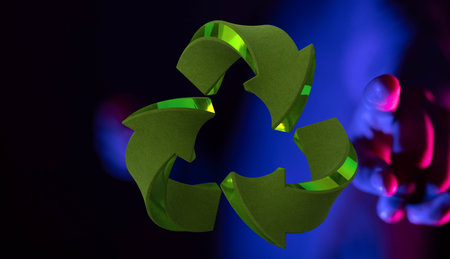A person's hand touching a3D rendered volumetric green recycling sign