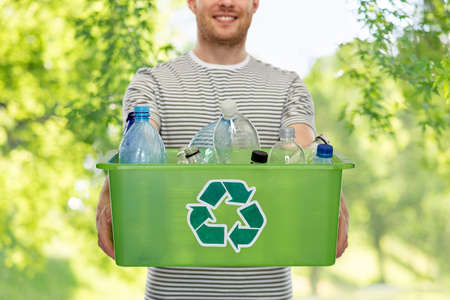Close-up of eco friendly person holding grey container with blue symbol with plastic bottles inside