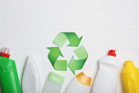 Flatlay composition with different empty plastic bottles, containers and recycling sign made of paper in the center over white background. Sorting, recycling waste concept. Horizontal shot. Top view