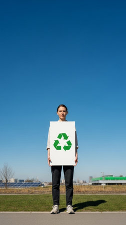 A captivating portrait of a young woman with striking green eyes, holding recycled materials, emphasizing sustainability and environmental awareness in an urban setting.