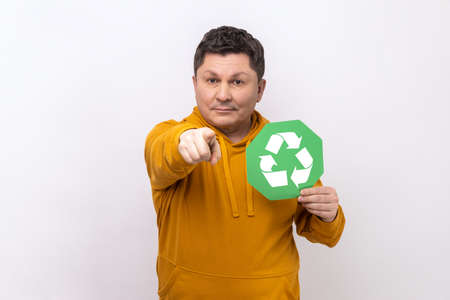 Portrait of man holding green recycling sign, pointing to camera, calls on to save our planet from pollution, wearing urban style hoodie. Indoor studio shot isolated on white background.