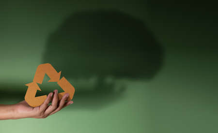 World Earth Day, Recycling and ESG Concept. Green Energy, Renewable and Sustainable Resources. Environmental Care. Hand Levitating a Recycle Symbol and Shading Shadow as a Big Tree