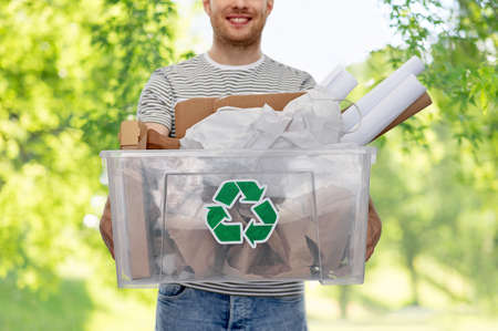 smiling young man sorting paper waste