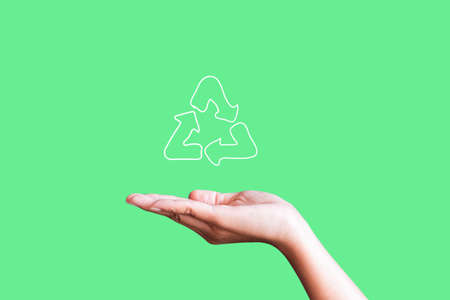 woman holding icon recycle on green background