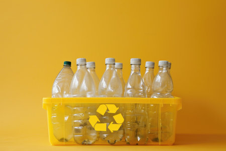 Plastic bottles with recycling symbol on yellow background. Recycling concept
