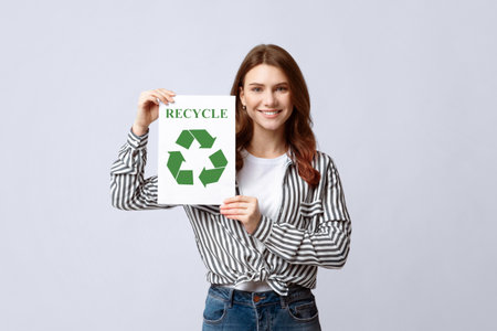 Recycle Concept. Young Smiling Woman Holding Placard With Green Recycling Sign