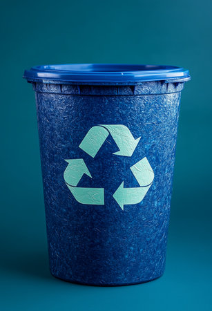 Bright blue recycling bin with a prominent recycling symbol stands against a solid green background, promoting sustainable waste management practices and environmental responsibility.