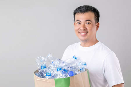 Recycle concept : Portrait Asian man holding many empty clear old water bottle. Studio shot on grey background
