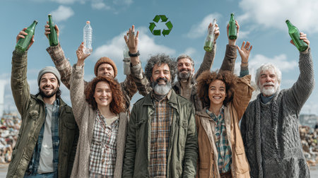 A diverse and joyful group of individuals raises recycled bottles in celebration of environmental efforts. Their smiles symbolize unity and commitment to sustainability initiatives.