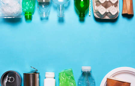 Household waste on a blue background. The concept of sorting plastic, polyethylene cardboard, paper, glass. Environment protection