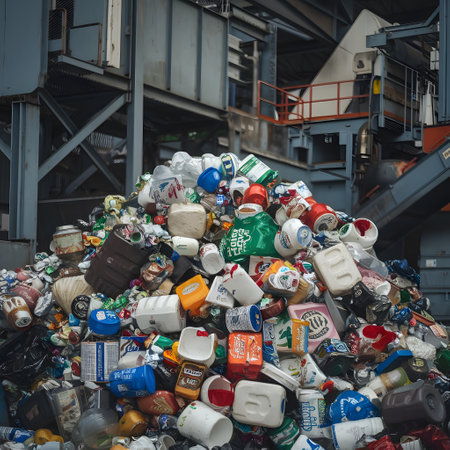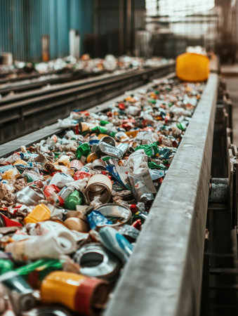 Conveyor belts transport sorted waste materials in a large recycling plant, showing the process of waste management and sustainability.