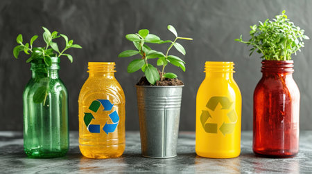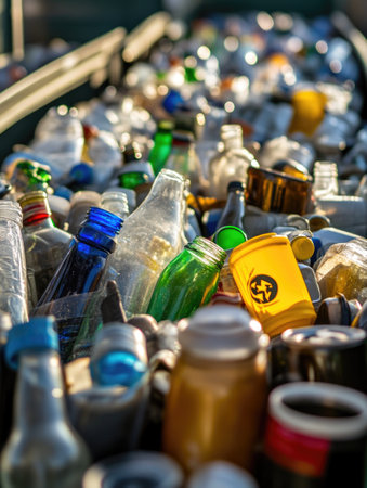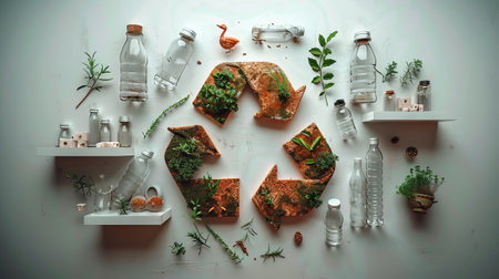 This unique image features a recycling symbol crafted from crushed plastic bottles and cans, highlighting the importance of sustainable practices and environmental responsibility.