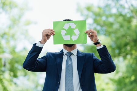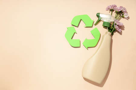 Waste bins and recycle sign. Ecology and environmental protection concept. Recycling dangerous materials idea. Copy space.