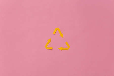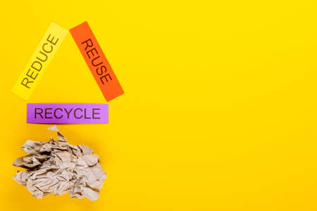Recycling concept showing reduce, reuse & recycle with paper on a yellow background