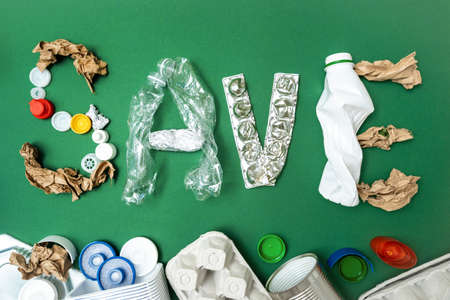 Help earth by recycling. Top view of word SAVE made of trash in composition with different types of garbage as paper, glass, plastics and other on green background. Environmental issues concept