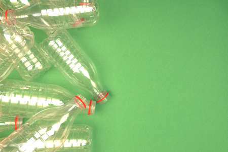 Empty plastic PET bottles on a green background. Waste sorting, environmental care. Copyspace.