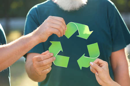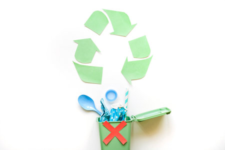 Close-up of a vibrant recycle symbol against a clean white backdrop, highlighting the urgency of recycling and sustainability, perfect for promotional content