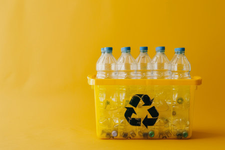 Recycling concept showing reduce, reuse & recycle with plastic on a yellow background