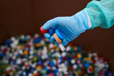 A human hand carefully sorts through a collection bin filled with plastic waste. This scene highlights the crucial process of recycling and waste management for a sustainable future.