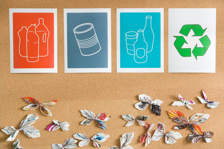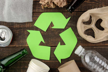 Top view of mixed recyclable materials featuring earth recycling symbol