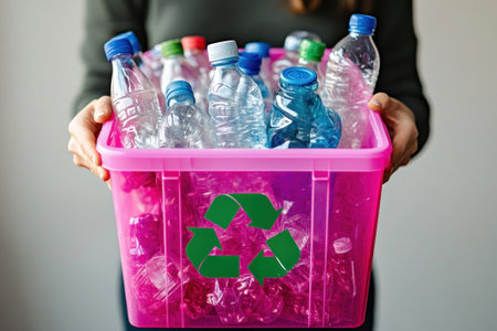 Close-up of eco friendly person holding grey container with blue symbol with plastic bottles inside