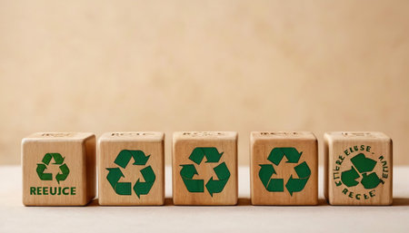 Wooden cube with recycle icon and green industrial. Eco-friendly business and development concept on background.