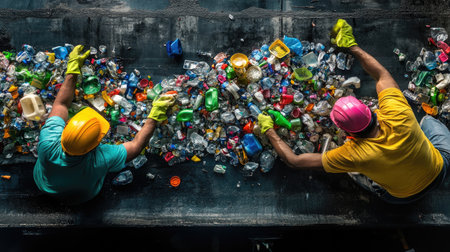 Two workers wearing helmets and gloves sort through a vibrant pile of plastic waste at a recycling facility, showcasing dedication to sustainability and teamwork.