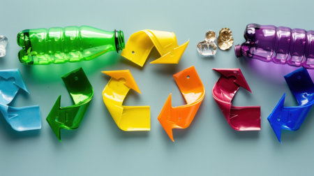 A vibrant arrangement featuring colorful plastic bottles and arrows, symbolizing recycling and sustainability on a blue background for environmental awareness.