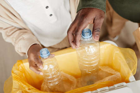 hand holding garbage bottle plastic putting into recycle bag for cleaning