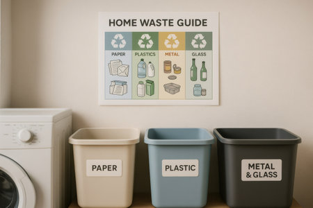 Different colored recycling bins standing below home waste sorting guide hanging on wall in laundry room promoting recycling and sustainability
