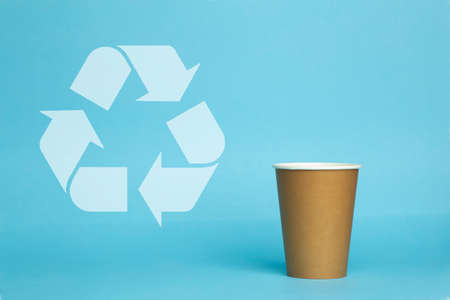 Paper cup for a drink on a blue background. Recycling of paper and environmental pollution and waste recycling
