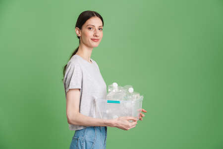 Young woman carrying a plastic container full with empty recyclable plastic. Recycling concept