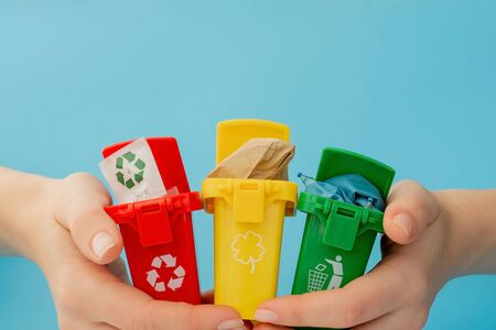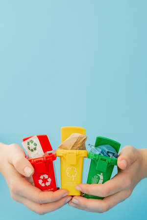 Concept of garbage sorting and ecology. Photo for website banner. Hands holding different trash