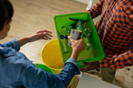High angle view of multiracial coupe collecting bottles and can in container at home. unaltered, lifestyle, togetherness, chores, housework, environmental conservation, recycling.