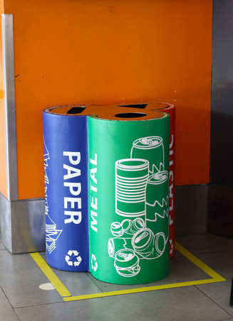 Sepang, Selangor, Malaysia - Mart 17, 2019: litter bins for different kinds of garbage at Kuala Lumpur International Airport. Recycling various types of recyclable garbage. Environmental protection