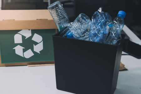 Plastic bottles in a recycling bin in a warehouse, blurred background