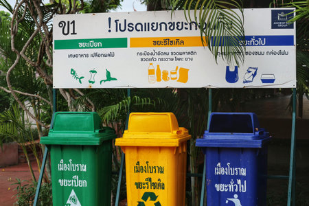 Bangkok, Thailand on 25 July 2023. Colorful recycling bins stand beneath a sign promoting waste sorting and recycling in public area Great for environmental or educational projects.