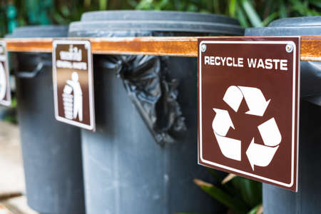 Black plastic bins with sorting trash sign in the public park, focus at the recycle waste symbolic and sign