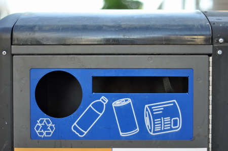 Blue recycle bin for cans, glass, plastic and paper in the park. The sign has inscription and symbol of recycling.
