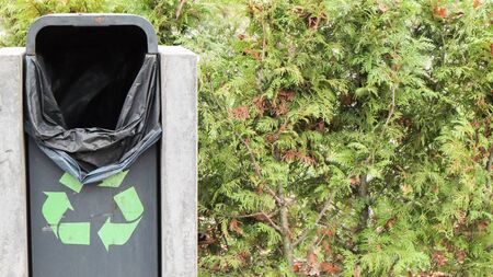 New green trash bin in the park in the fall. Close-up of a plastic and concrete dustbin set up in a public park along many trees and bushes in the background.