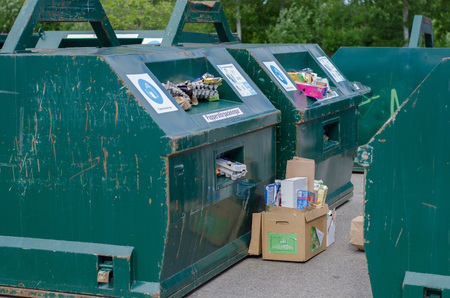 Green recycling containers full with paper and boxes at an environmental station in Soderhamn, Sweden - July 18 2017