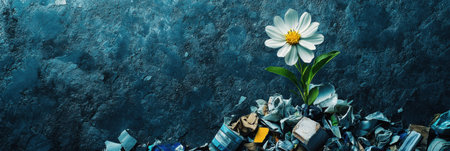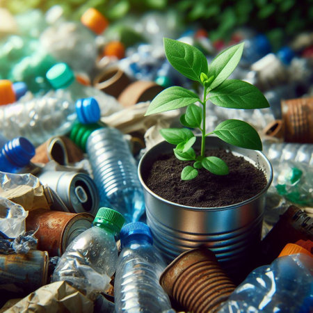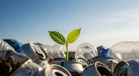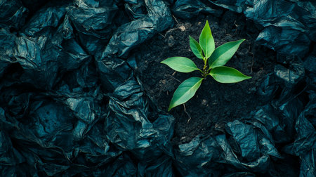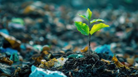 In a world cluttered with discarded waste and pollution, a single, vibrant green seedling pushes through the debris. This powerful image symbolizes hope, resilience, and the enduring strength of nature against environmental challenges, representing a new beginning and the urgent need for conservation.