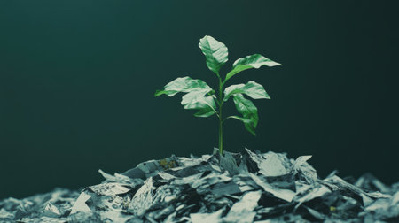 Budding Life Emerging from Textured Rubbish Heap, Symbolizing Hope and Environmental Resilience