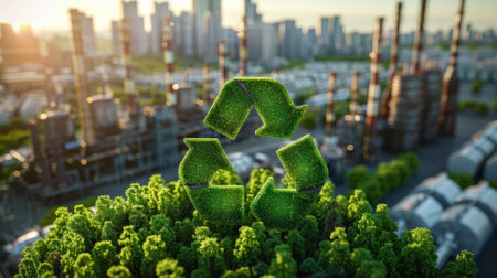 This visual highlights sustainable development with a strong focus on recycling and eco-friendly practices, surrounded by lush greenery and a textured backdrop that promotes environmental awareness.