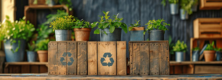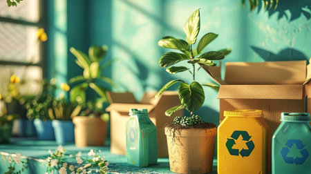 Eco-friendly lifestyle captured in a serene setting with vibrant potted plants and colorful recycling bins, inspiring sustainable living. Generated A.I.