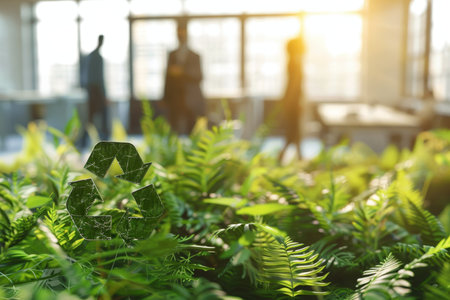 A close up of a green recycle symbol surrounded by foliage in a modern office space, with blurred silhouettes of people engaging in conversation in the background. The scene is bathed in warm, natural light, emphasizing sustainability and environmental awareness.
